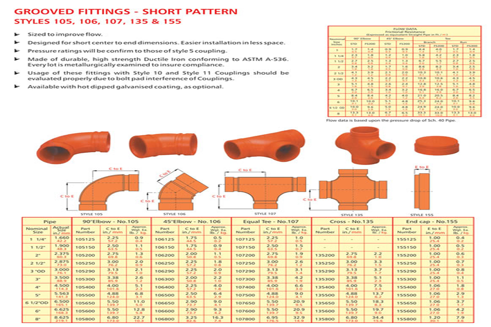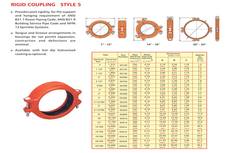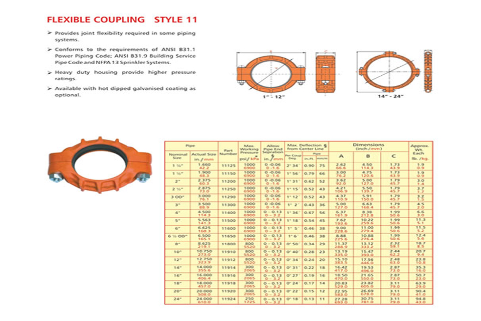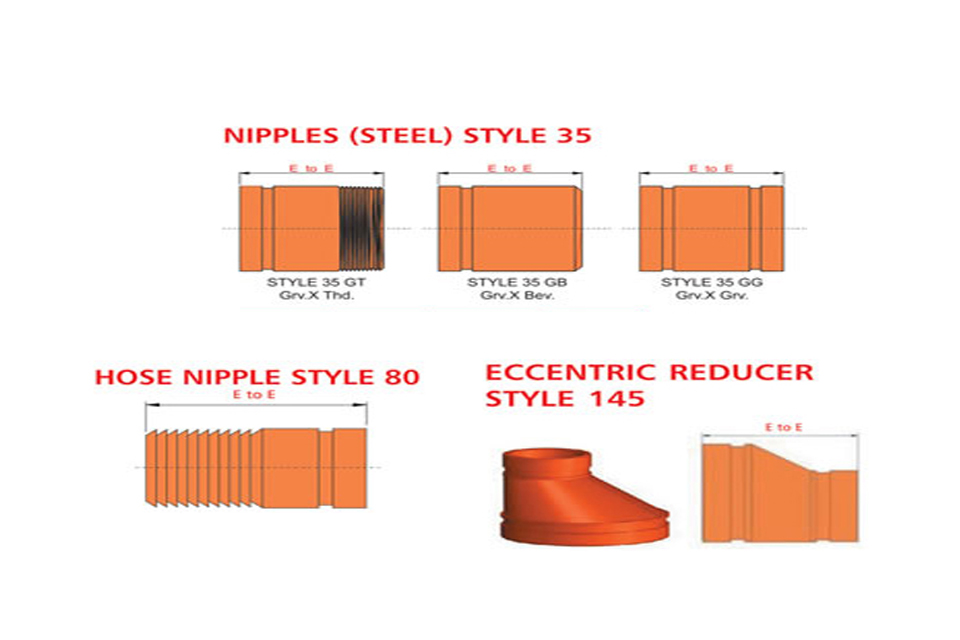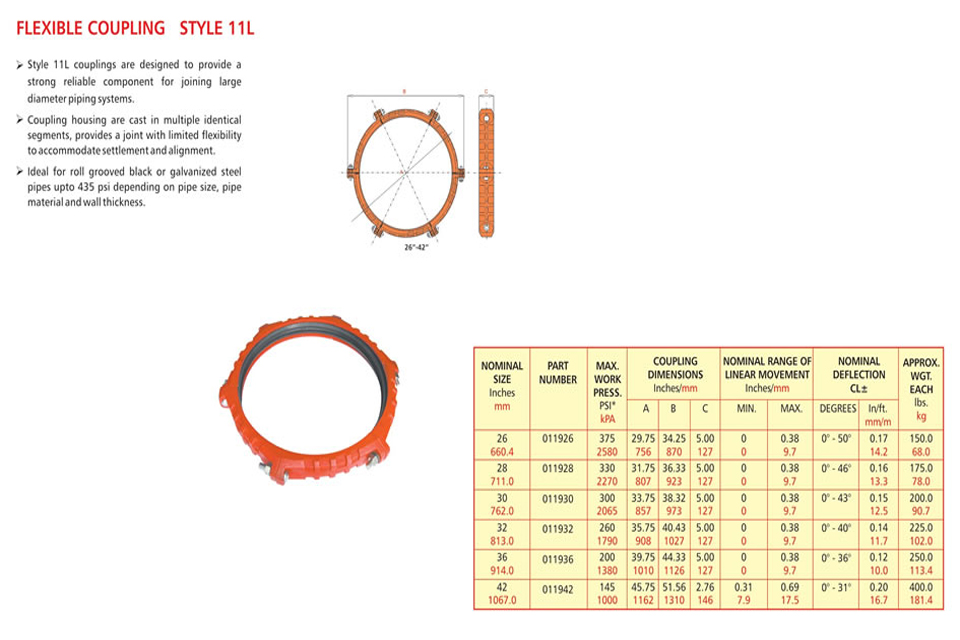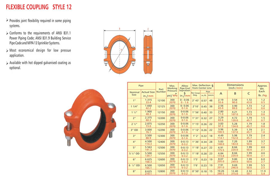 Grooved piping system is reliable and is faster to install than welding, threading or flanging, resulting in lowest installed cost. It can be adopted to suit standard pipe with cut grooves or standard and light wall pipe with rolled grooves. Triple sealing of the C-shaped pressure responsive gasket is made from specially compounded rubbers with low compression set property. Couplings perform equally well under pressure and vacuum. Couplings with Tri-seal gaskets are highly suitable for higher vacuum service and dry systems subject to freezing. Couplings are available for flexible and rigid system. Grooved end fitting are machined to AWWA c606 cut groove standard Products are offered with RAL 3000 alkyl enamel rust preventive paint as standard and hot dipped galvanized coating is available optionally.