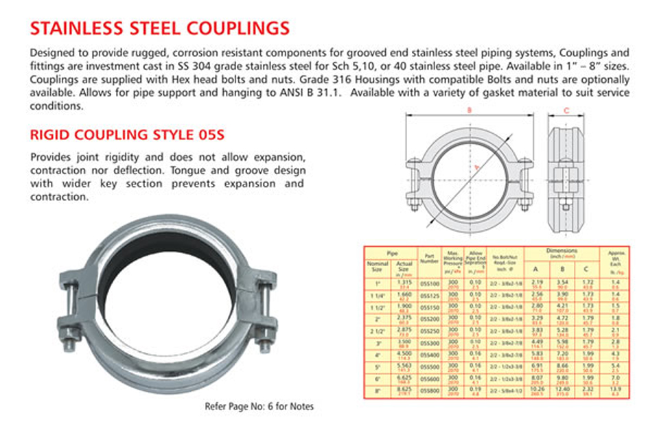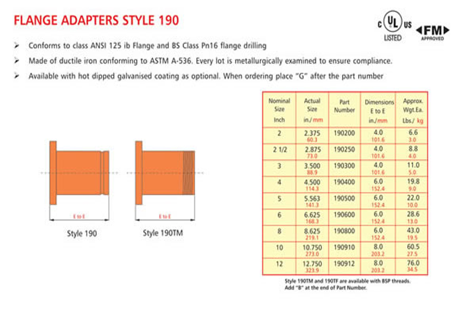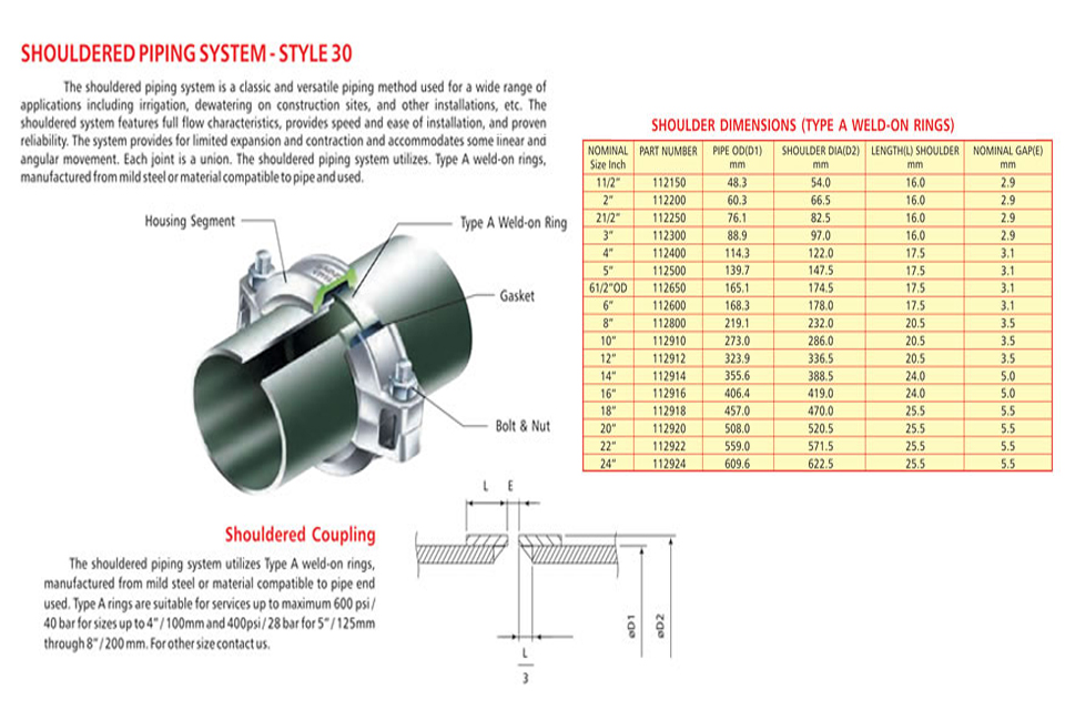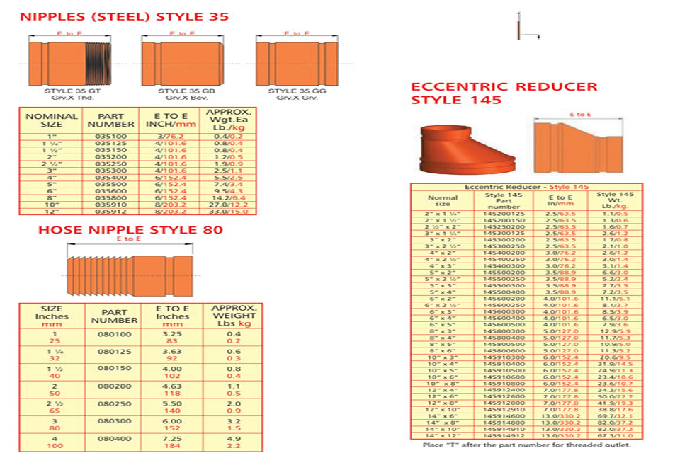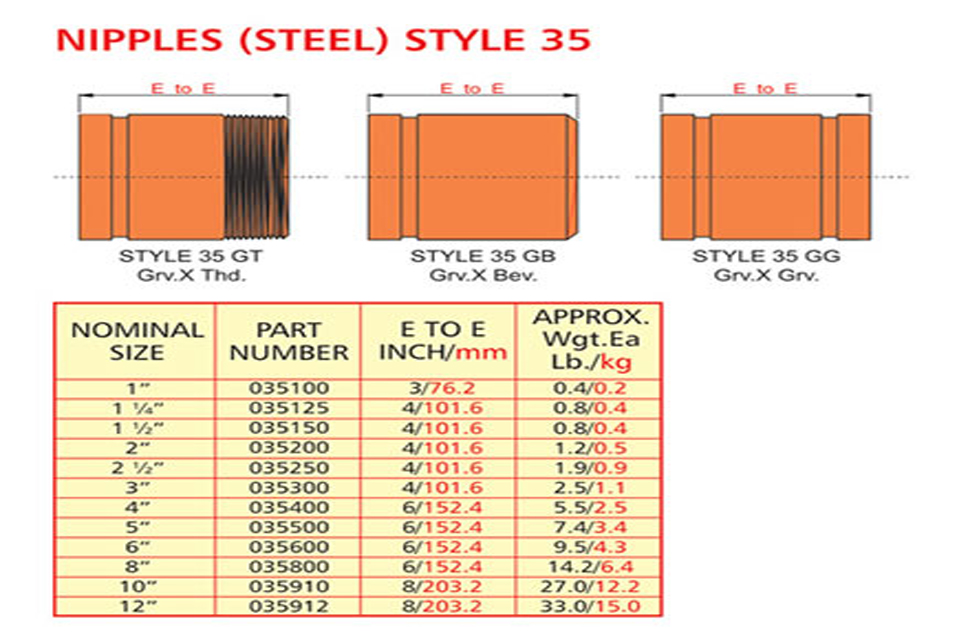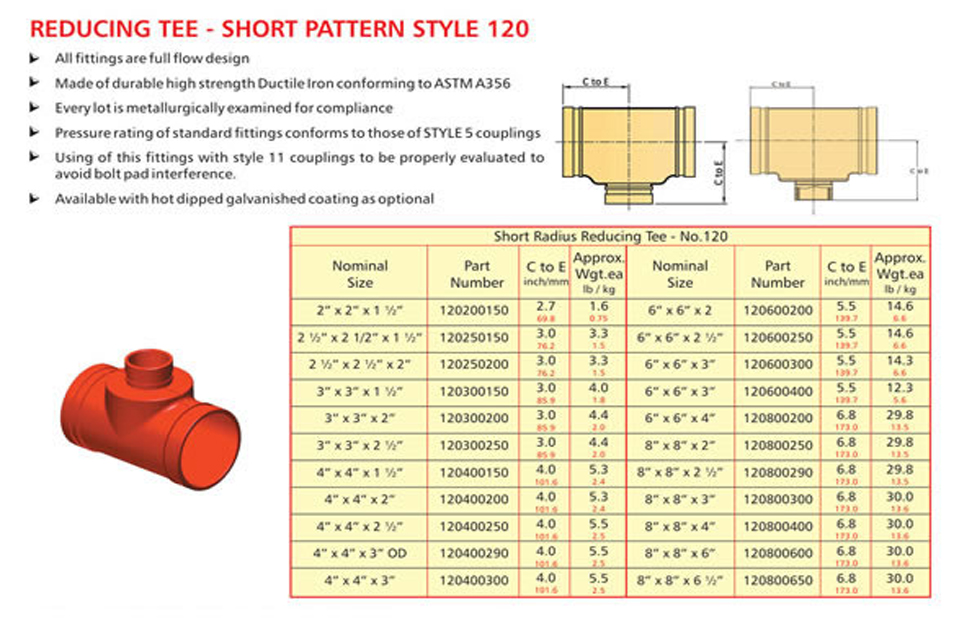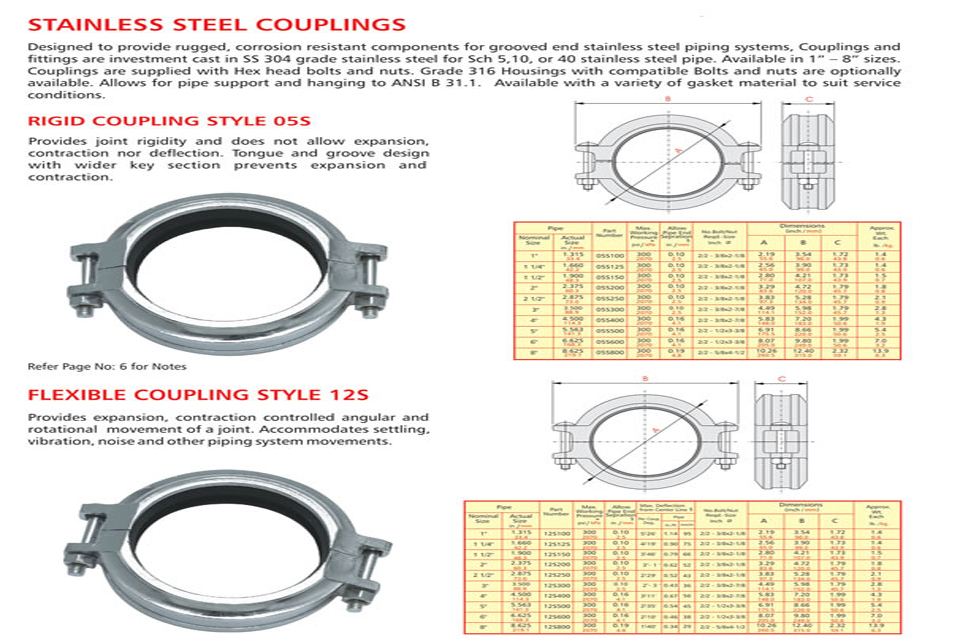 Grooved piping system is reliable and is faster to install than welding, threading or flanging, resulting in lowest installed cost. It can be adopted to suit standard pipe with cut grooves or standard and light wall pipe with rolled grooves. Triple sealing of the C-shaped pressure responsive gasket is made from specially compounded rubbers with low compression set property. Couplings perform equally well under pressure and vacuum. Couplings with Tri-seal gaskets are highly suitable for higher vacuum service and dry systems subject to freezing. Couplings are available for flexible and rigid system. Grooved end fitting are machined to AWWA c606 cut groove standard Products are offered with RAL 3000 alkyl enamel rust preventive paint as standard and hot dipped galvanized coating is available optionally.